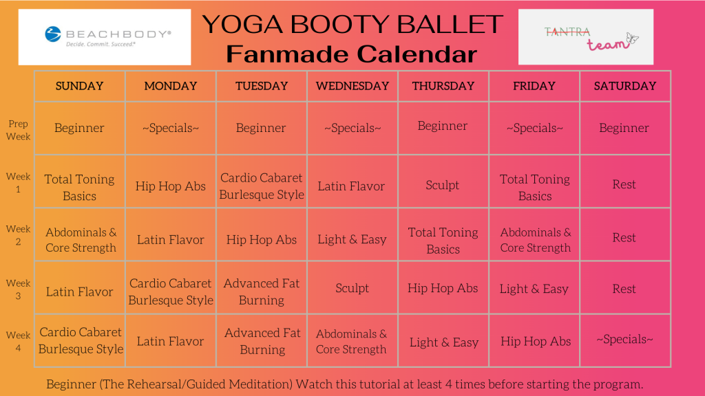 This will be a short post for today. I am almost finished with Beachbody’s Power 90 (P90) and I am going to make the comparison review of this program with Debbie Siebers’ Slim in 6. In the meantime, I have created a fanmade Yoga Booty Ballet calendar.